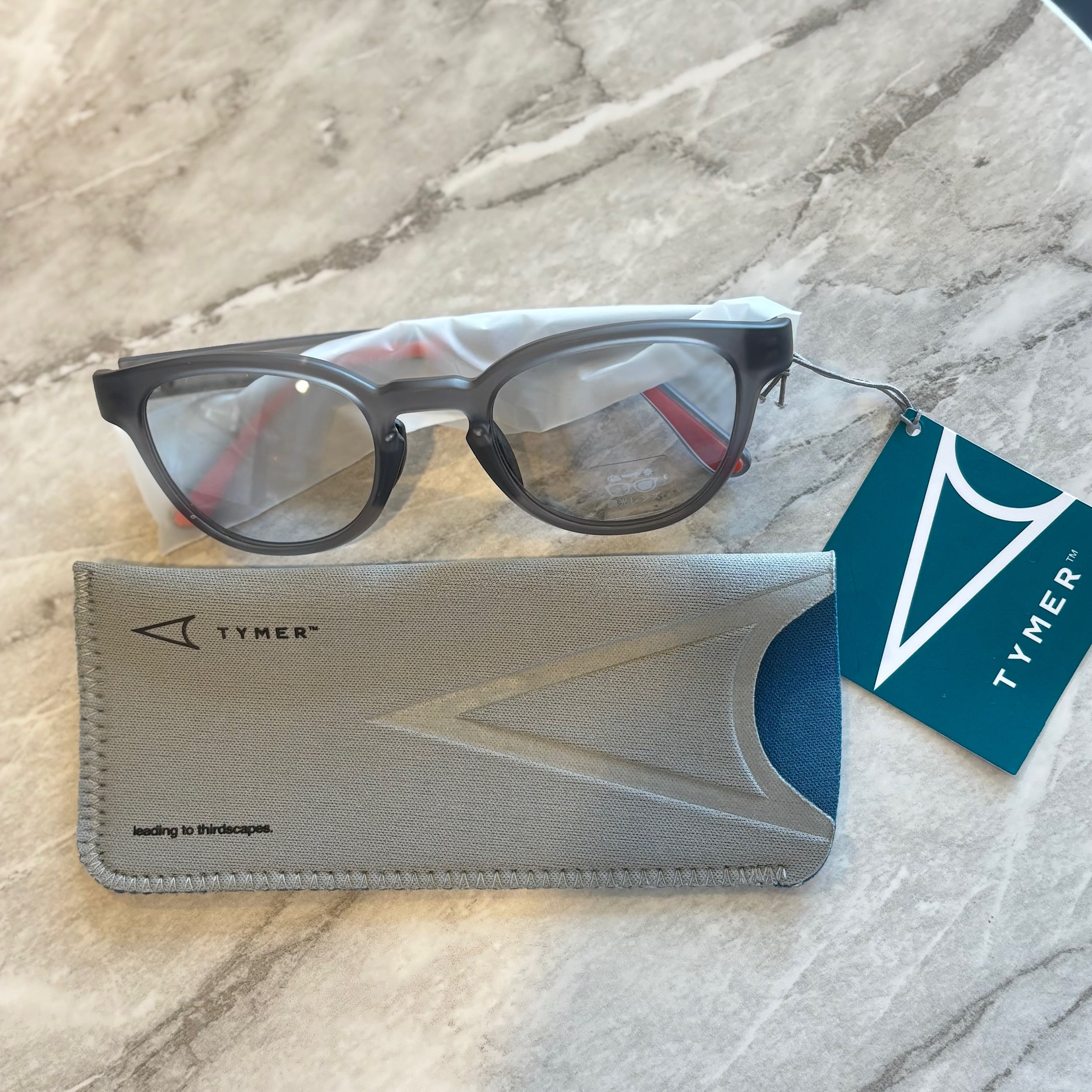 フレームはマットクリアグレー、レンズは紫外線量により明るさが変わる調光レンズ。