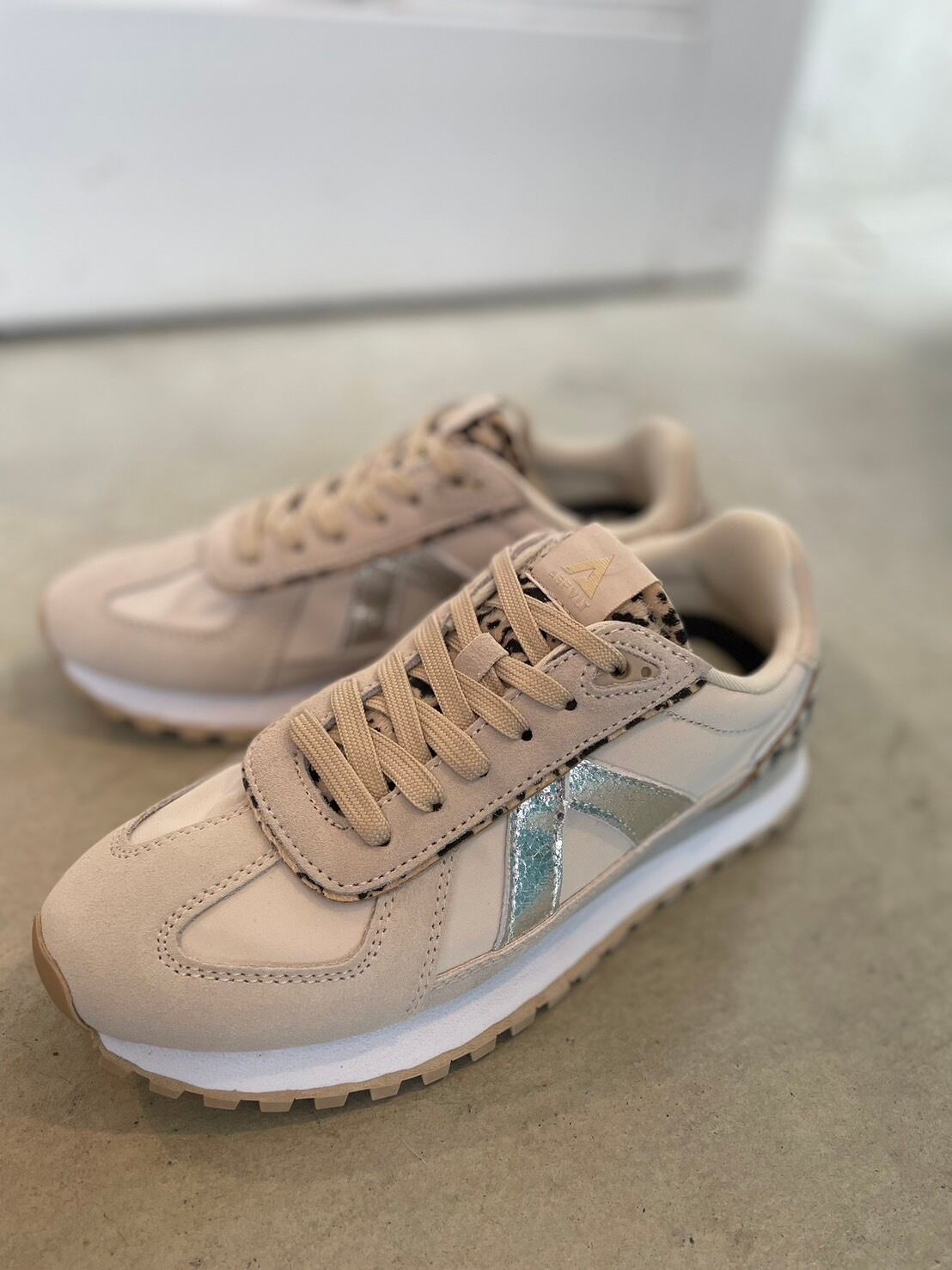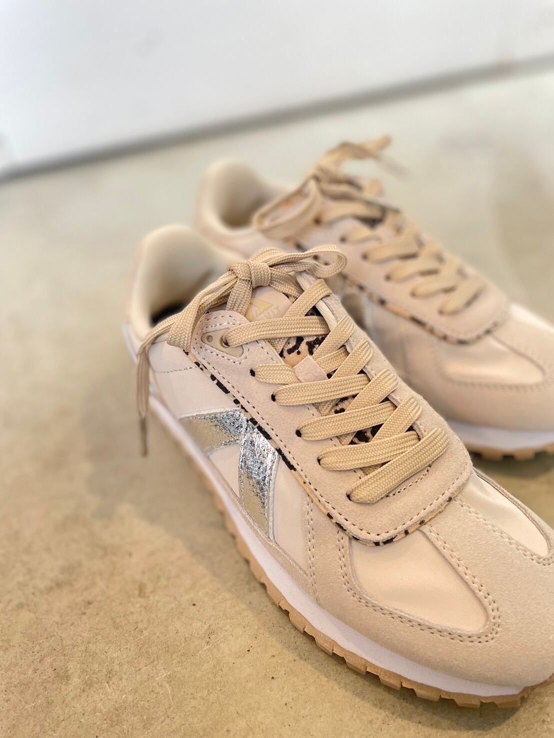 グレージュカラーをベースにシルバーのライン、踵のハラコ素材など異素材がミックスされたマルチカラー。
