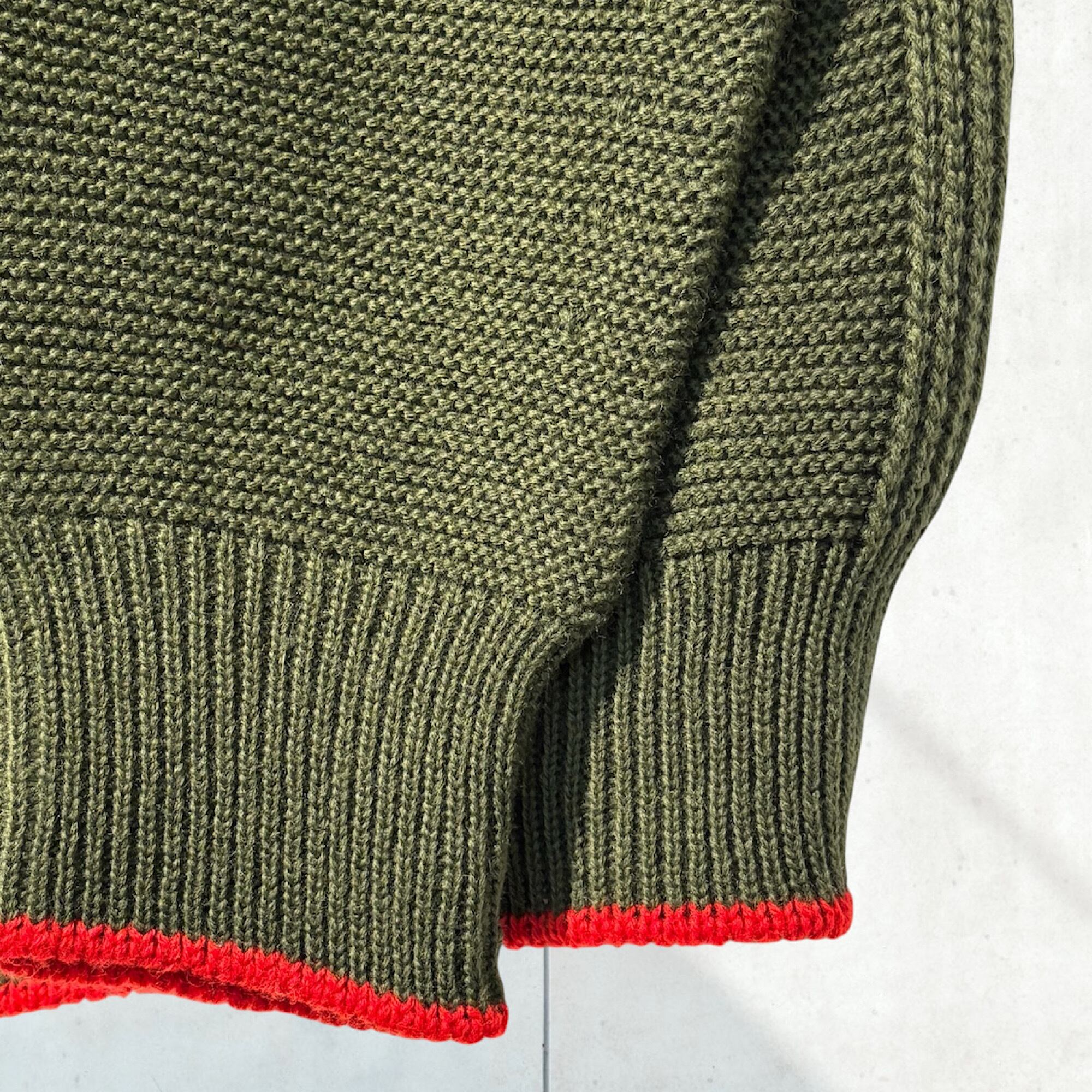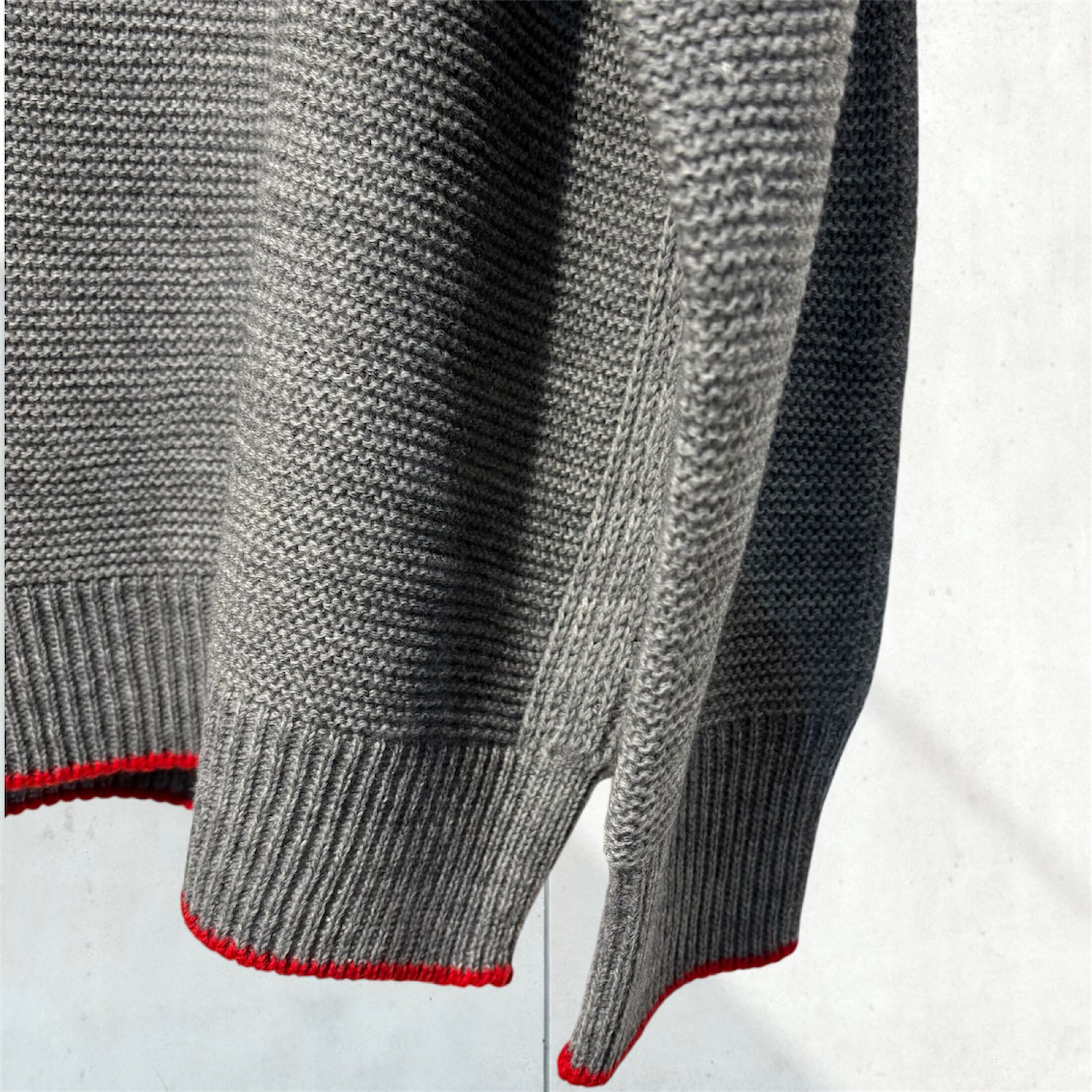このニットプルオーバーは、裾と袖口の赤いラインがアクセントになっており、カジュアルながらもオシャレな印象を与えます。
