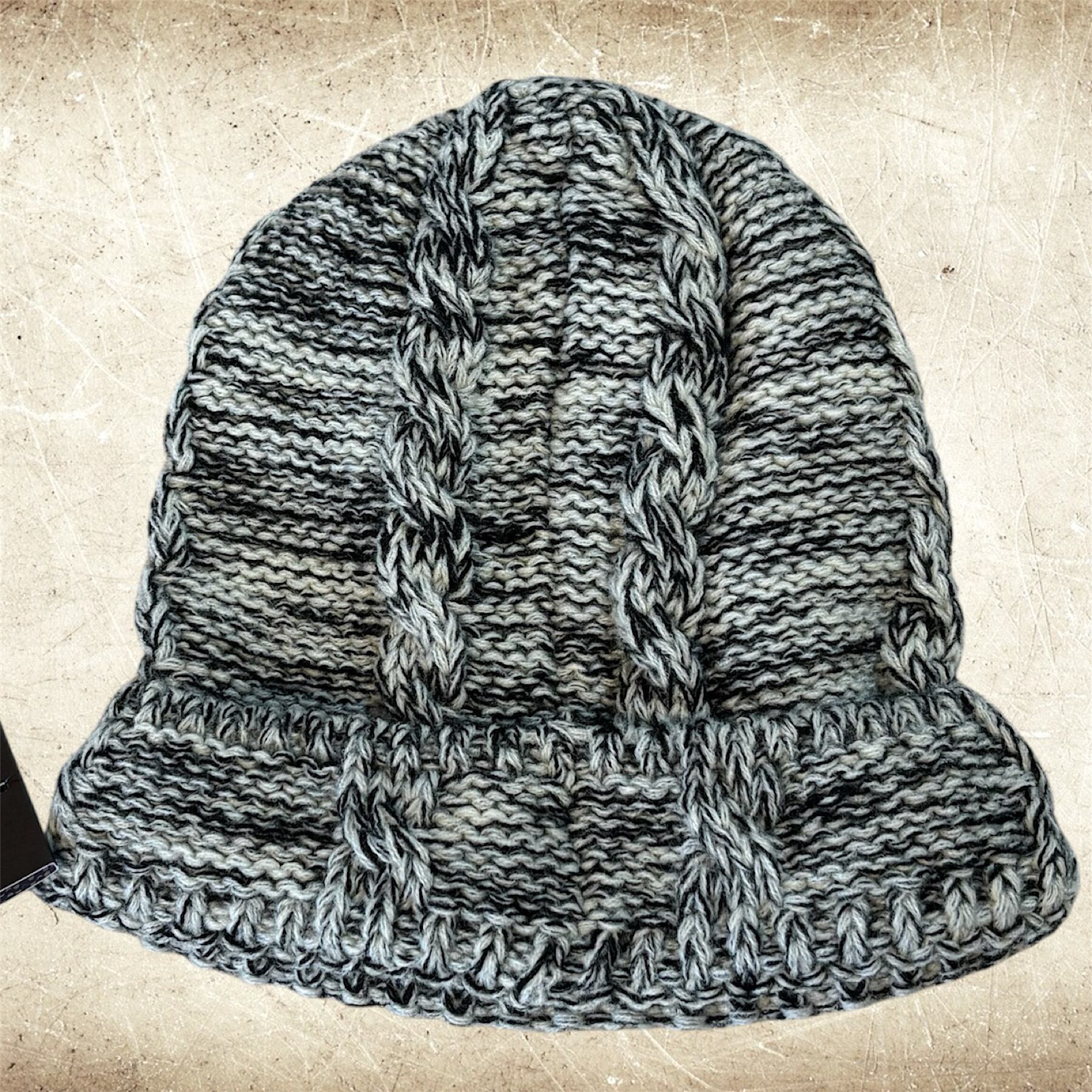 ミックスカラーの糸を使用し、裏メリヤス編みとケーブル編み合わせたニットキャップ。